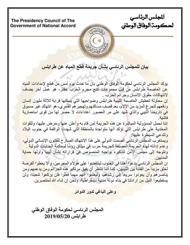وفي سياق متصل أعلن المجلس الرئاسي لحكومة الوفاق الوطني عن استغرابه للصمت الدولي على ما وصفه بـ”الانتهاك الصارخ للقانون الإنساني” وعدم إدانته لجريمة قطع المياه عن طرابلس.