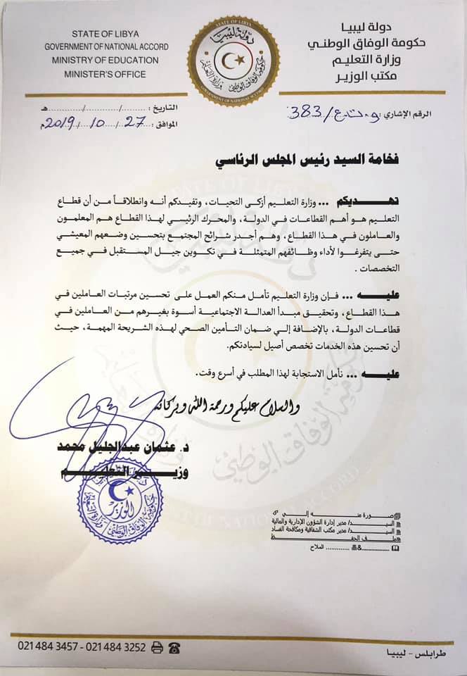 جاء ذلك في خطاب الوزير رقم و. ت. ع /383 الموجه لرئيس المجلس الرئاسي، بشأن تحسين مرتبات العاملين في قطاع التعليم والتسريع في تنفيذ برنامج التأمين الصحي للموظفين.