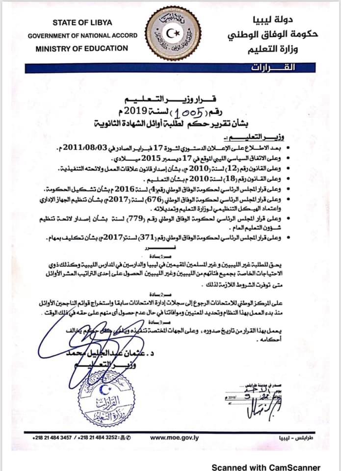 ويحق بموجب المادة الأولى من القرار، للطلبة غير الليبيين وغير المسلمين المقيمين في ليبيا والدارسين في المدارس الليبية وكذلك ذويالاحتياجات الخاصة بجميع فئاتهم من الليبيين وغير الليبيين الحصول على إحدى التراتيب الأوائل متى توفرت الشروط اللازمة لذلك.