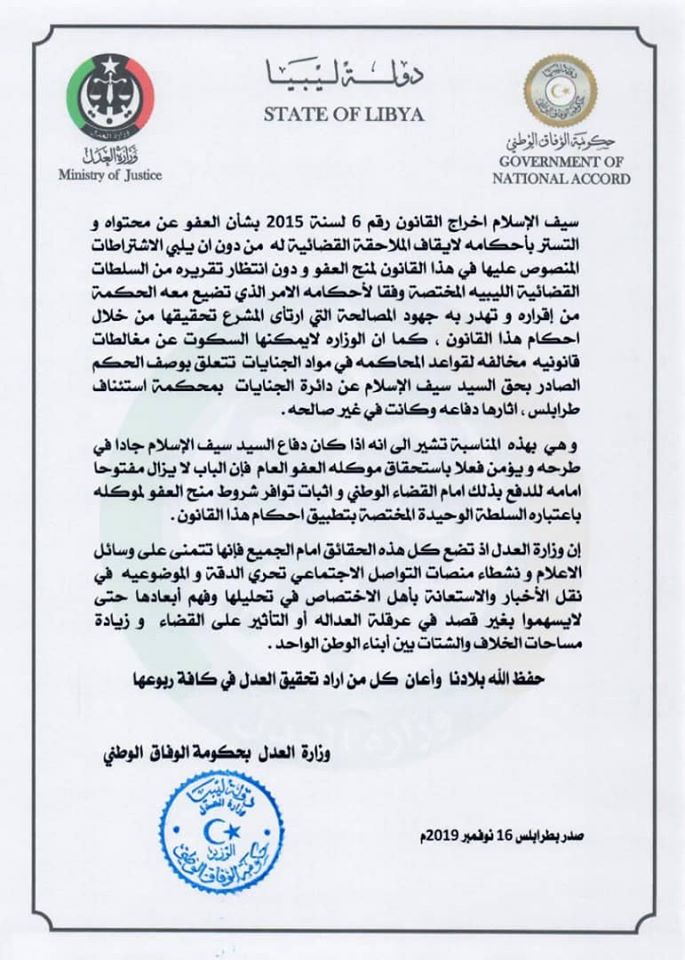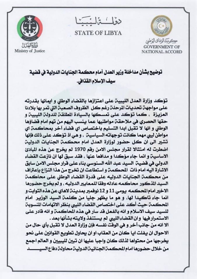 أكدت وزارة العدل بحكومة الوفاق على اختصاص القضاء الليبي بنظر الاتهامات المنسوبة لسيف القذافي وتمسكها بالسيادة المطلقة للدولة الليبية وحقها الحصري في ملاحقة مواطنيها وعدم التسليم باختصاص أي قضاء آخر في محاكمة أي مواطن ليبي مهما كانت توجهاته السياسية.