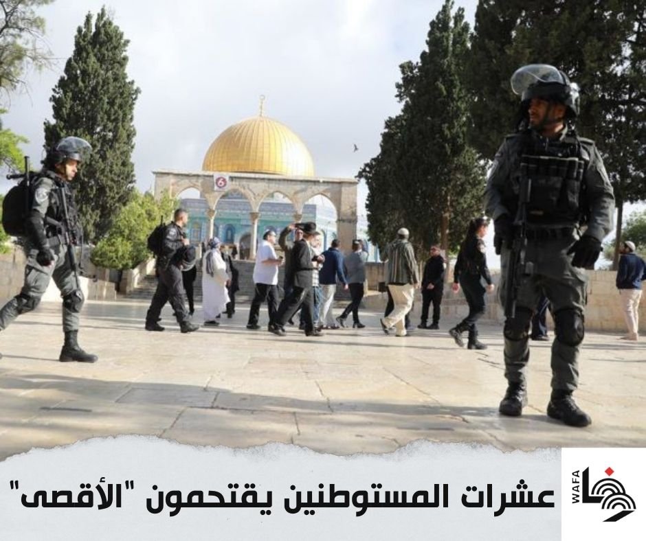 وأفادت وكالة الأنباء الفلسطينية “وفا”، بأن عشرات المستوطنين اقتحموا المسجد الأقصى على شكل مجموعات، من جهة باب المغاربة، وأدوا طقوسا تلمودية ونفذوا جولات استفزازية في باحاته، واستمعوا لشروحات مزيفة حول الهيكل المزعوم.