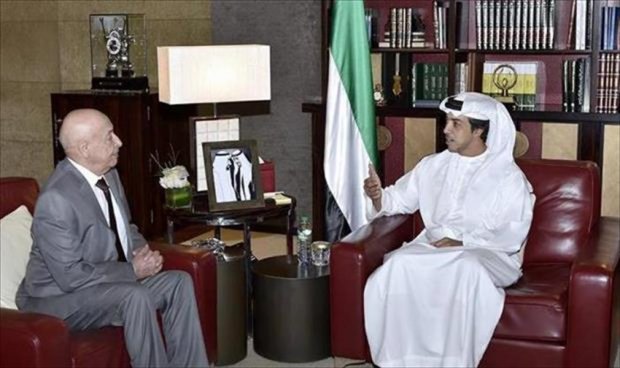 بحث رئيس مجلس النواب المستشار عقيلة صالح، مع نائب رئيس مجلس الوزراء وزير شؤون الرئاسة في دولة الإمارات الشيخ منصور بن زايد آل نهيان تعزيز العلاقات بين ليبيا والإمارات.