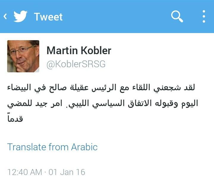 وكتب المبعوث الأممي على صفحته بتويتر «لقد شجعني اللقاء مع الرئيس عقيلة صالح في البيضاء اليوم وقبوله الاتفاق السياسي الليبي. امر جيد للمضي قدماً» مشيراً إلى أنه أجرى محادثة هاتفية طويلة مع القائد العام للجيش الفريق أول ركن خليفة حفتر.