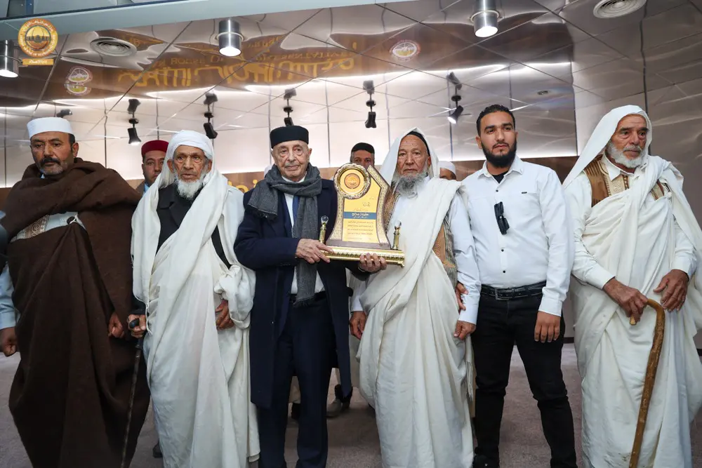 واختتم اللقاء بتقديم عميد وأعيان ومشايخ وحكماء بلدية تندميرة، “درع الشجاعة رئيس مجلس النواب المستشار ” عقيلة صالح ” تقدير وعرفاناً لقيادته الحكيمة وسعيه الدائم لتحقيق السلام والاستقرار والحفاظ على وحدة التراب الليبي”.