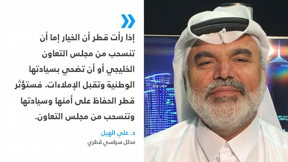 وقال “لكن إذا رأت دولة قطر أن الخيار: إما أن تنسحب من مجلس التعاون الخليجي أو أن تضحي بسيادتها الوطنية وتقبل الإملاءات التي وردت في اللائحة والمهلة المذلة وغير القانونية، فقطر ستؤثر الحفاظ على أمنها الوطني وسيادتها الوطنية، وتنسحب من مجلس التعاون”.