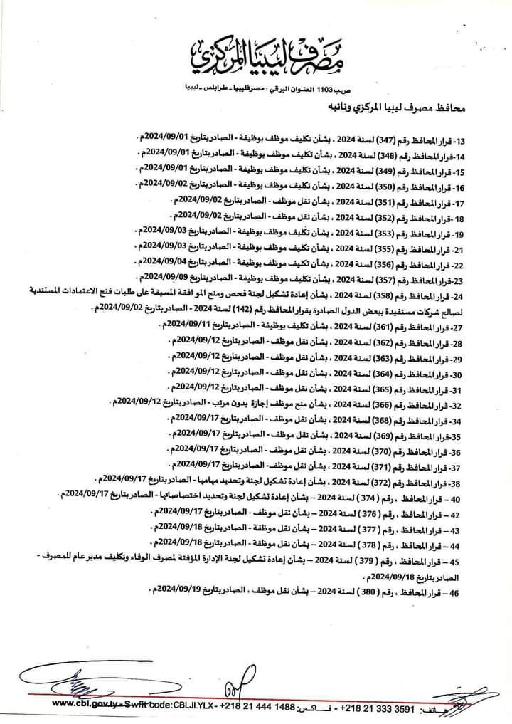 أصدر مصرف ليبيا المركزي قرارًا بسحب القرارات كافة الصادرة عن المحافظ السابق المكلف خلال الفترة من 27 أغسطس إلى 1 أكتوبر 2024.