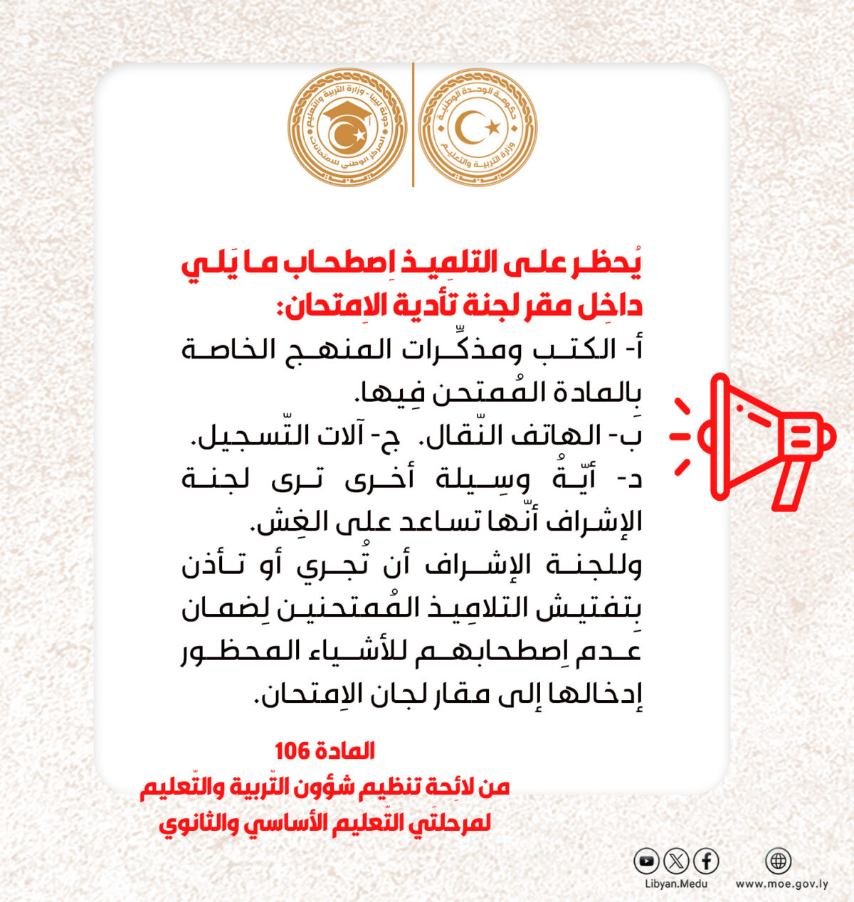 بمشاركة أكثر من 200 ألف طالب وطالبة تبدأ يوم غد الثلاثاء، امتحانات الدور الأول لشهادة اتمام مرحلة التعليم الاساسي في كافة المناطق الليبية.