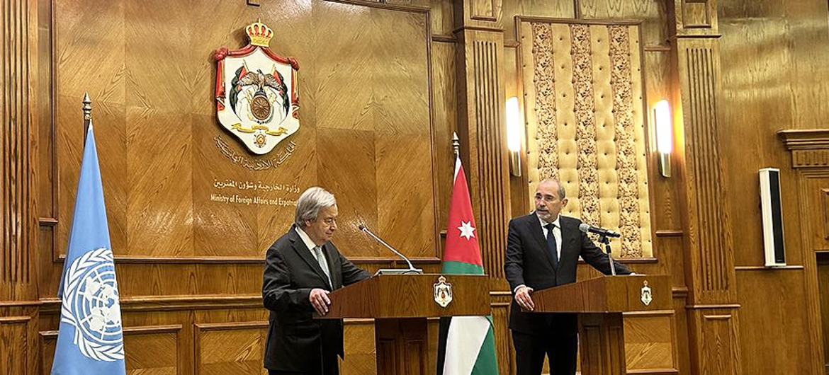 وخلال مؤتمر صحفي مشترك مع وزير خارجية الأردن أيمن الصفدي في عمان، قال غوتيريش” إن القلوب مثقلة بالألم خلال شهر رمضان هذا، في المنطقة وحول العالم “بسبب الدمار المستمر وغير المسبوق في غزة”.