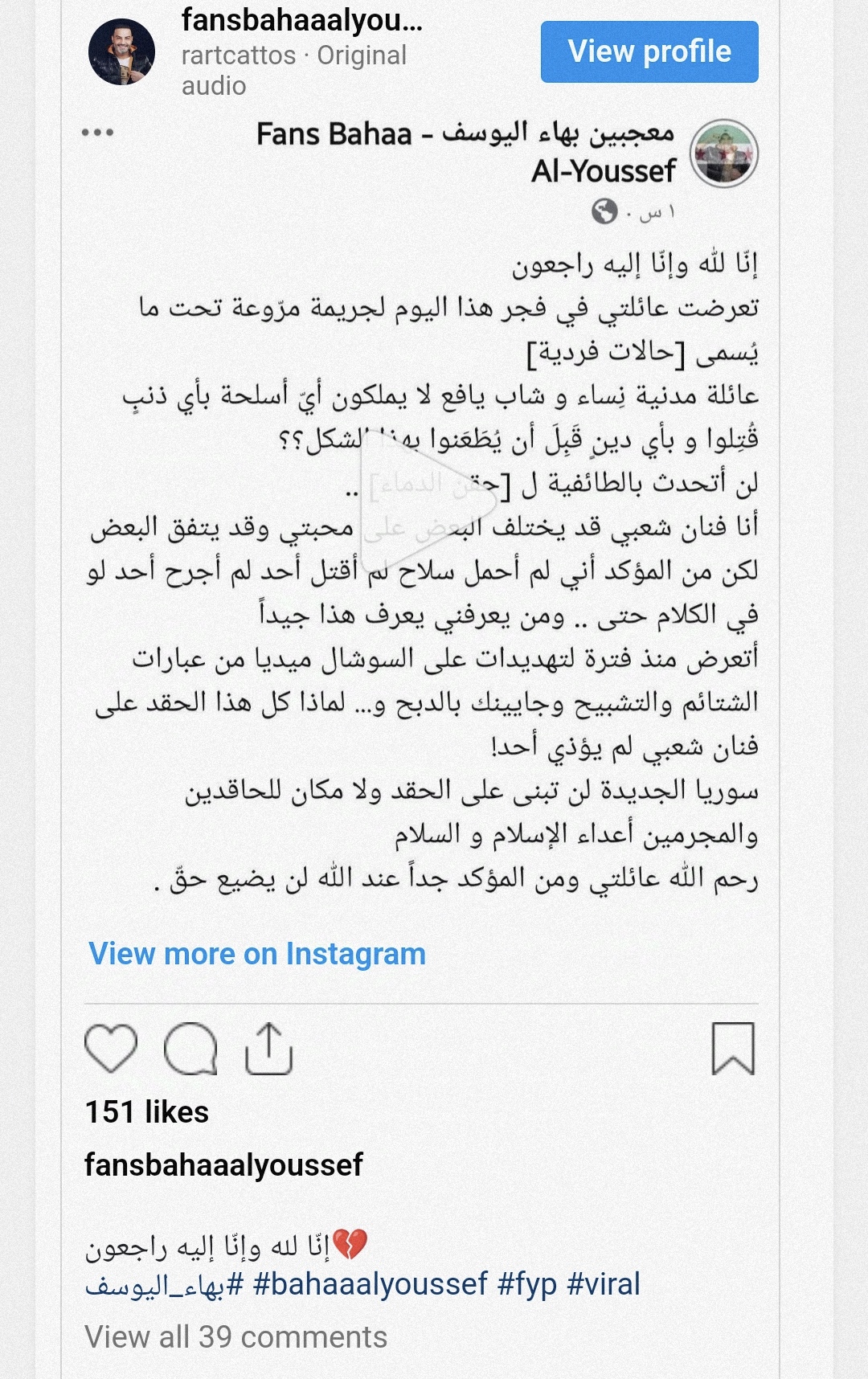 وفي حسابه على “إنستغرام”، نشر بهاء اليوسف، تفاصيل الحادثة، وجاء في المنشور: “إنا لله وإنا إليه راجعون.. تعرضت عائلتي في فجر هذا اليوم لجريمة مروعة تحت ما يسمى “حالات فردية”.. عائلة مدنية نساء وشاب يافع لا يملكون أي أسلحة بأي ذنب قُتلوا وبأي دين قَبل أن يطعنوا بهذا الشكل؟؟”