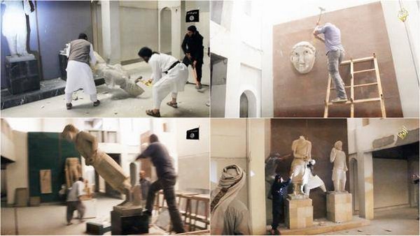وظهر في الفيديو رجال ينتمون فيما يبدو لتنظيم الدولة الإسلامية يحطمون التماثيل التي كان بعضها مُعَرَفا بأنه يرجع إلى القرن السابع قبل الميلاد بالمعدات الثقيلة والمثاقيب قائلين إنها رمز للوثنية.