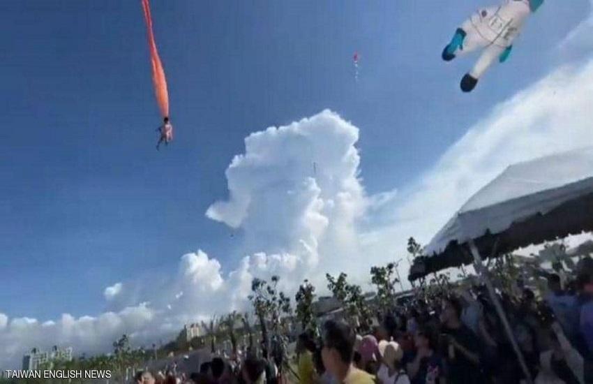 وأظهرت لقطات من مهرجان في بلدة Nanlioao الساحلية بتايوان أمس الأحد مجموعة من المشاركين يحاولون جاهدا الوصول إلى الطائرة التي حلقت عاليا بفعل الرياح العاتية.