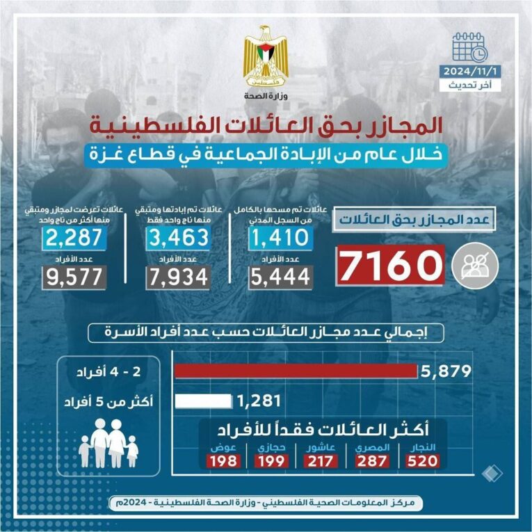 وكانت وزارة الصحة في قطاع غزة، نشرت اليوم الجمعة، تقريرا بشأن “حصيلة المجازر التي ارتكبها الجيش الإسرائيلي بحق العائلات الفلسطينية خلال عام من الإبادة الجماعية”.