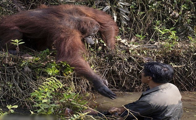 مدت قردة من نوع الأورانجوتان يدها لمساعدة رجل يقف داخل نهر، ربما ظنت أنه عاجز عن الخروج.
