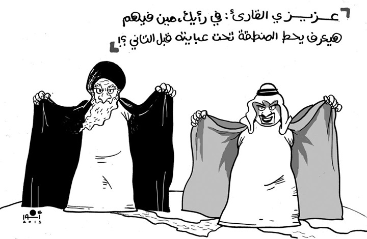 نشرت صحيفة المصري اليوم رسماً كاريكاتورياً يظهر شخصيتين الأولى خليجية والأخرى إيرانية تفتح كل منها عباءتها للهيمنة على المنطقة.