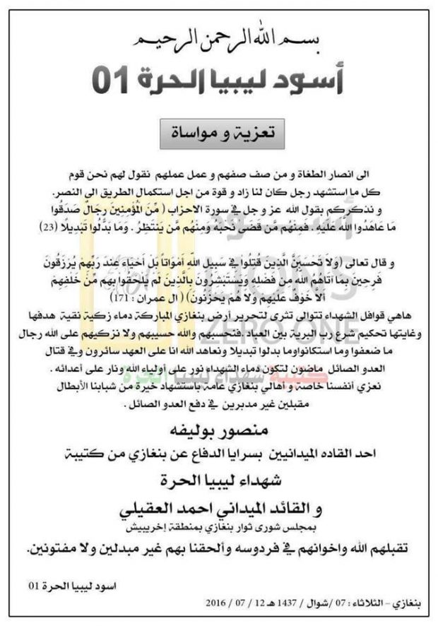 نعت كتيبة أسود ليبيا الحرة (01) في بيان لها اليوم الثلاثاء، مقتل القائد الميداني بسرايا الدفاع عن بنغازي من كتيبة شهداء ليبيا الحرة منصور بوليفة والقائد الميداني بمجلس شورى بنغازي بـ (محور اخريبيش) أحمد العقيلي، في مواجهات مع قوات الكرامة.