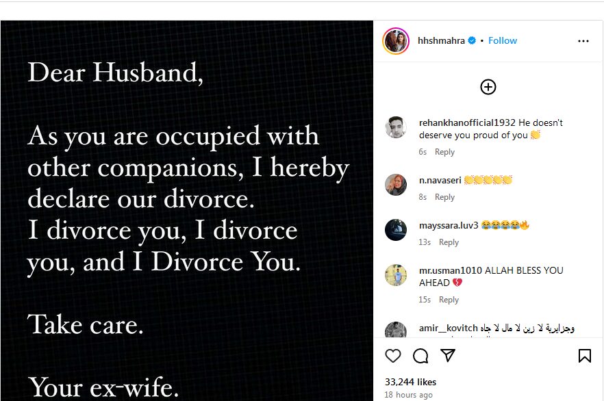 وجاء في منشور الشيخة مهرة:” الزوج العزيز، بما أنك مشغول برفقة آخرين، أعلن بموجب هذا طلاقنا. أنا أطلقك، أنا أطلقك، وأنا أطلقك. اعتنِ بنفسك. زوجتك السابقة”.
