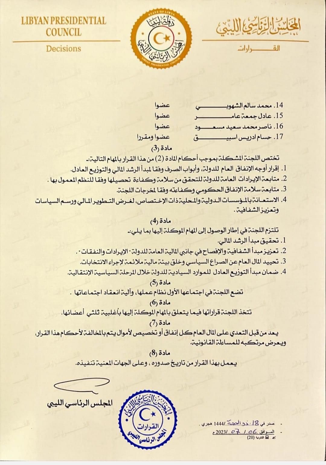 أصدر المجلس الرئاسي قرارا بتشكيل «لجنة مالية عليا» برئاسة محمد المنفي وفرحات بن قدارة نائبا له وعضوية 16 آخرين بينهم مسؤولون ووزراء.