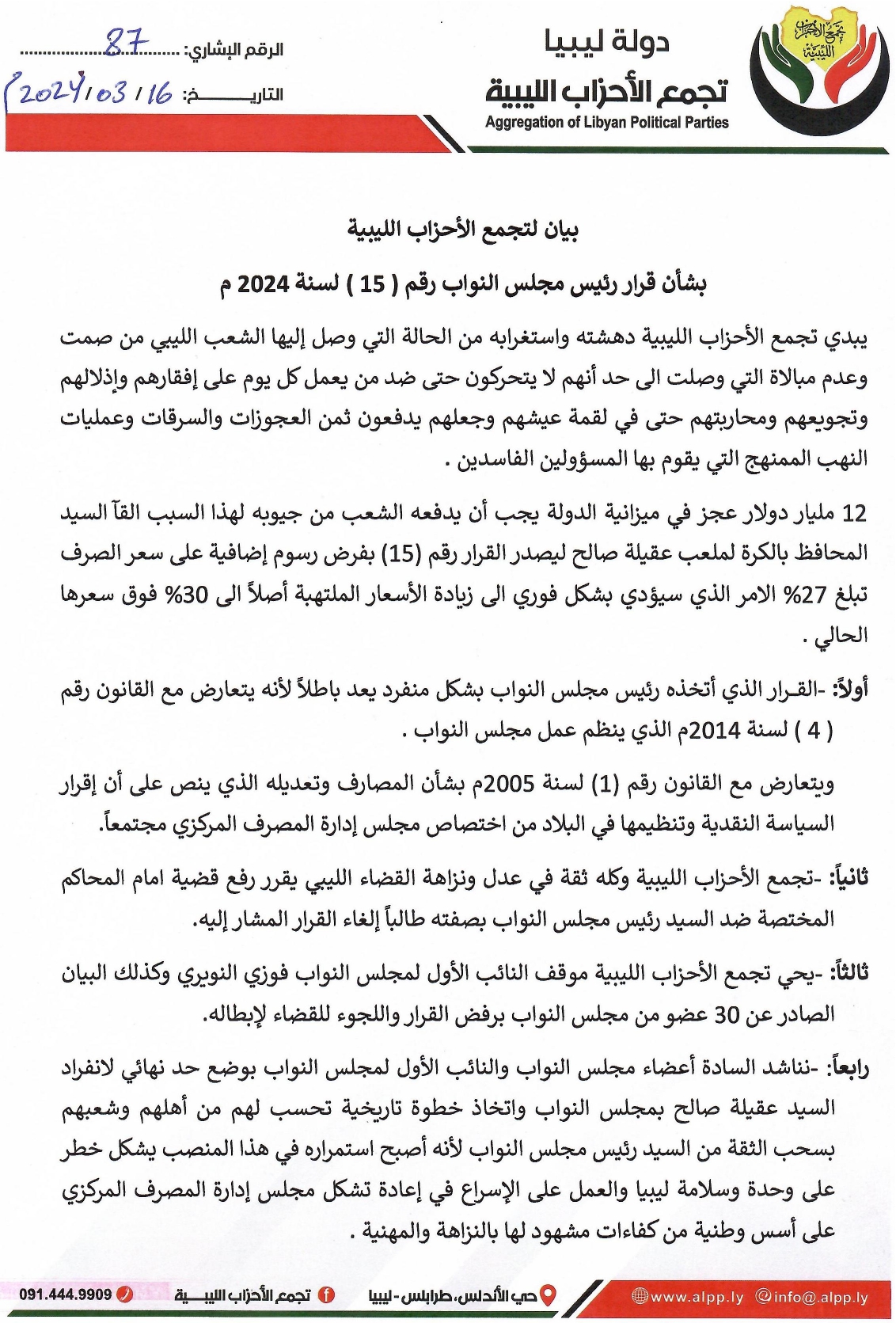 ونوه التجمع إلى أن القرار الذي اتخذه رئيس مجلس النواب بشكل منفرد يعد باطلا لأنه يتعارض مع القانون رقم 4 لسنة 2014 الذي ينظم عمل مجلس النواب، ويتعارض مع القانون رقم 1 لسنة 2005 بشأن المصارف وتعديله الذي ينص على أن إقرار السياسة النقدية وتنظيمها في البلاد من اختصاص مجلس إدارة المصرف المركزي مجتمعا.