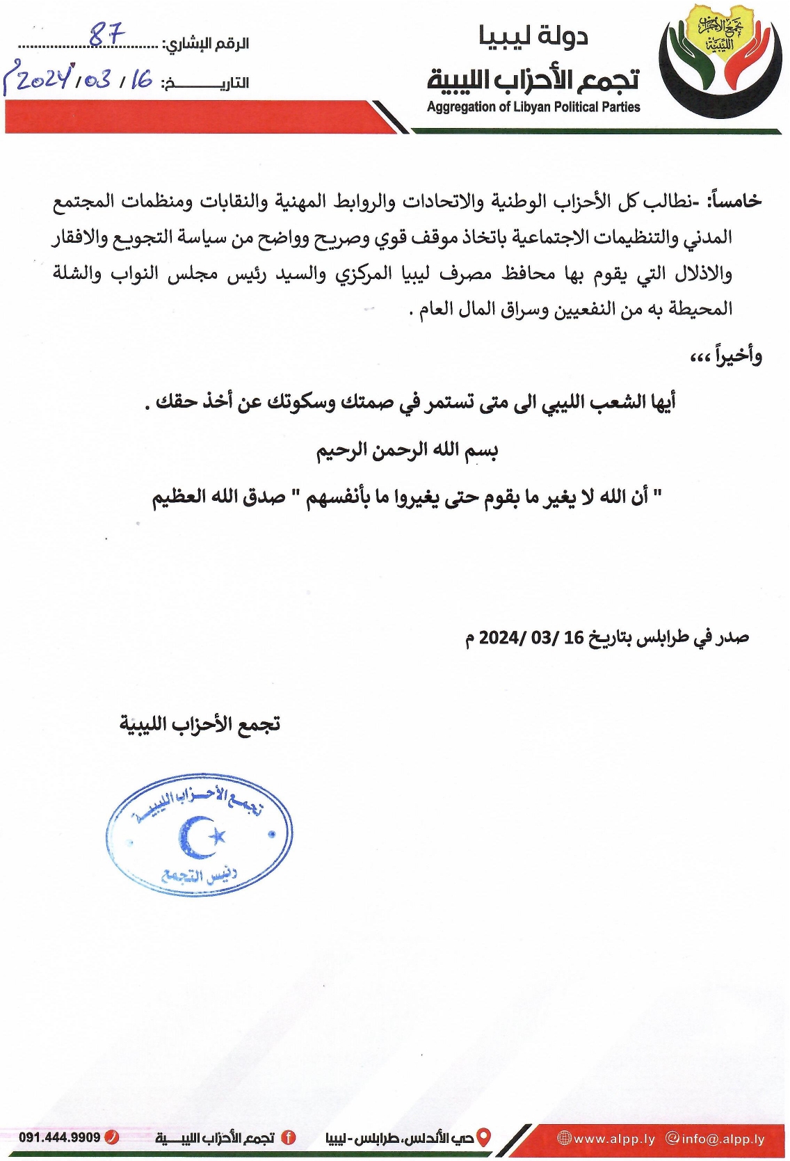 وناشد تجمع الأحزاب الليبية أعضاء مجلس النواب والنائب الأول لمجلس النواب بوضع حد نهائي لانفراد عقيلة صالح بمجلس النواب واتخاذ خطوة تاريخية تُحسب لهم من أهلهم وشعبهم بسحب الثقة من رئيس مجلس النواب لأنه أصبح استمراره في هذا المنصب يُشكل خطرا على وحدة وسلامة ليبيا.