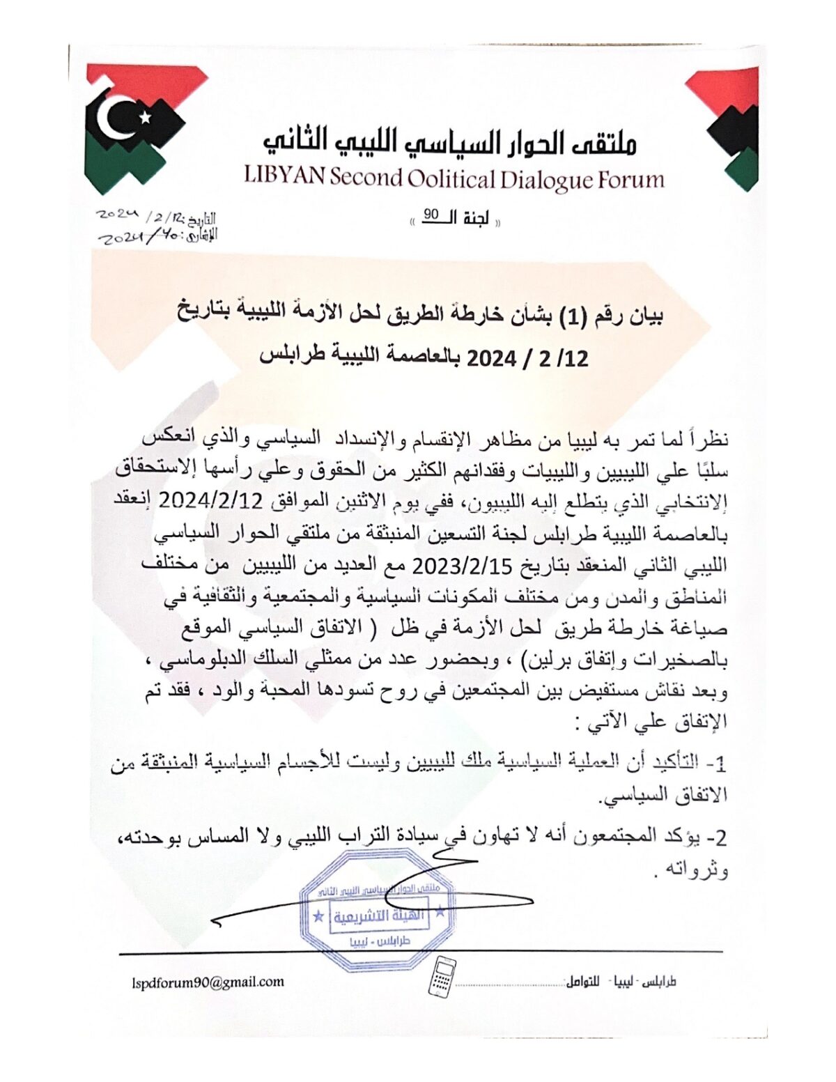وتم الاتفاق خلال الاجتماع، على دعم خارطة الطريق المقدمة من لجنة الـ،90 والتي تمثل نموذجا جامعاً لمكونات الشعب الليبي المتطلع لآماله وطموحاته لمدنية الدولة واسترداد الاستحقاق الانتخابي المفقود، بحسب نص البيان.