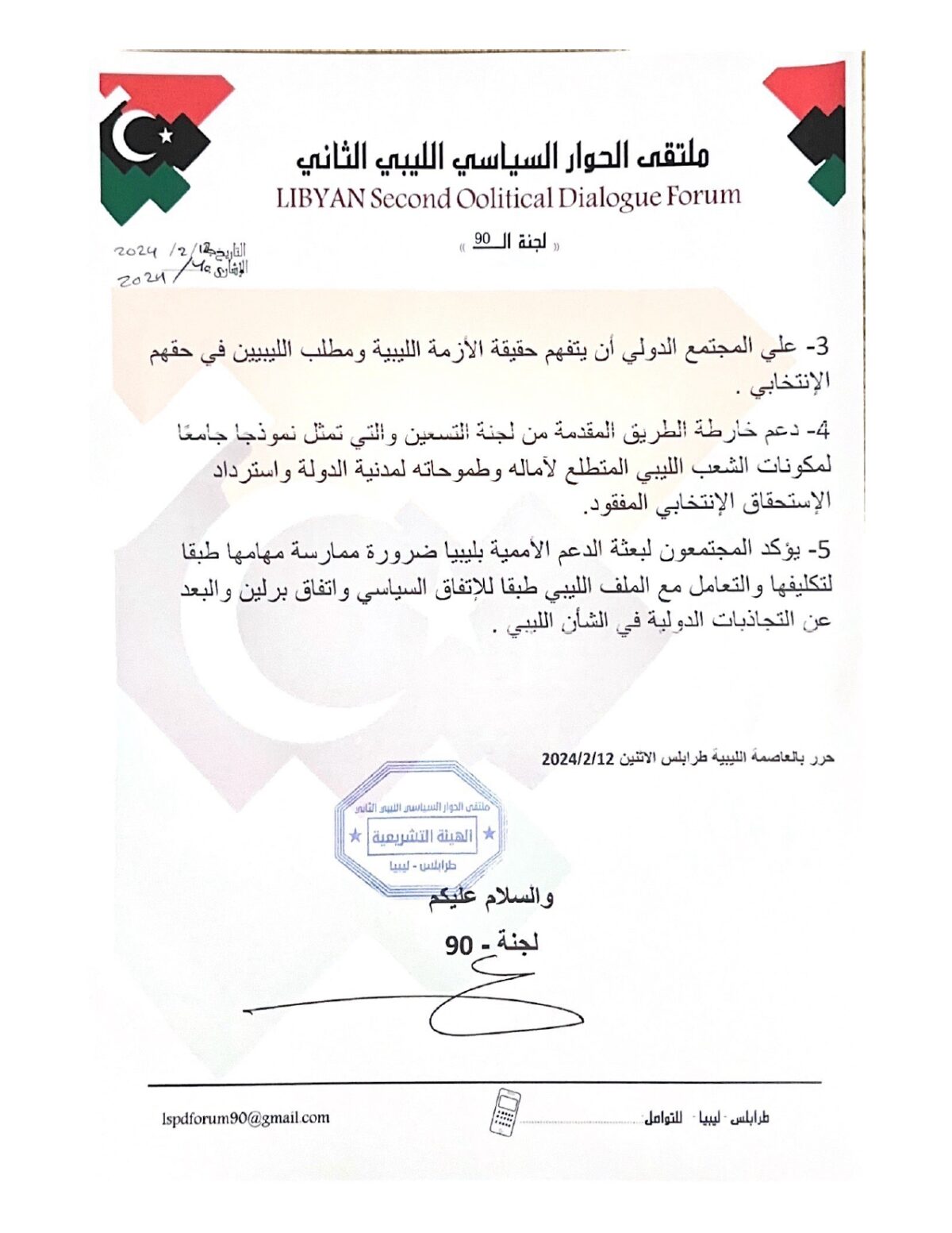 طالبت لجنة الـ90 المنبثقة من ملتقى الحوار السياسي الليي الثاني، من المجتمع الدولي بتفهم حقيقة الأزمة الليبية ومطلب الليبيين في حقهم الانتخابي.