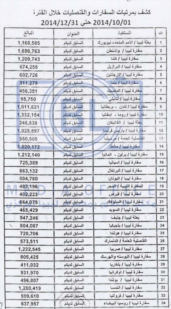 وأضاف المصرف في بيان نشره على موقعه الإلكتروني، أن المرتبات تمثل مخصصات الربع الأخير من 1 أكتوبر 2014 إلى 31 ديسمبر 2014 وذلك وفقًا للكشف التالي: