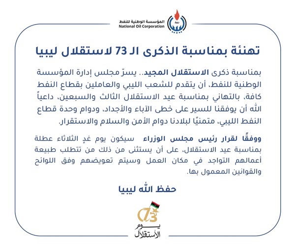وقالت لمؤسسة: “بمناسبة ذكرى الاستقلال المجيد.. يسرّ مجلس إدارة المؤسسة الوطنية للنفط، أن يتقدم للشعب الليبي والعاملين بقطاع النفط كافة، بالتهاني بمناسبة عيد الاستقلال الثالث والسبعين، داعياً الله أن يوفقنا للسير على خطى الآباء والأجداد، ودوام وحدة قطاع النفط الليبي، متمنيًا لبلادنا دوام الأمن والسلام والاستقرار”.