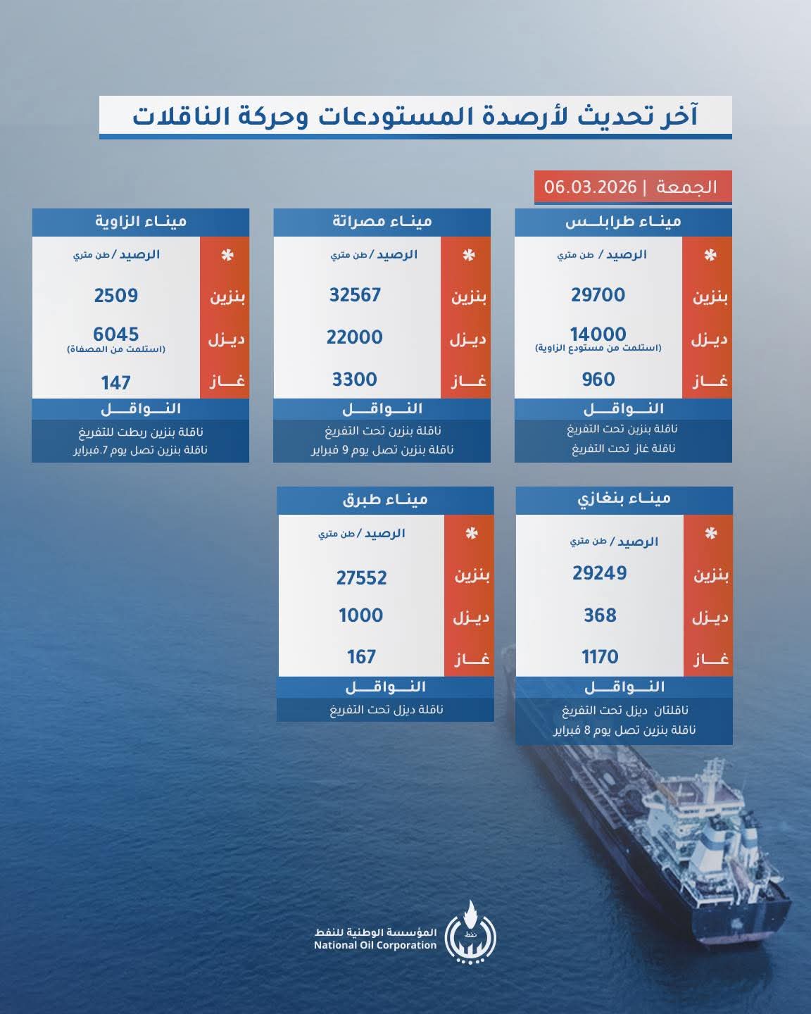 أعلنت المؤسسة الوطنية للنفط تحديثًا جديدًا لأرصدة مستودعات الوقود في عدد من الموانئ الليبية، إضافةً إلى حركة ناقلات الوقود العاملة على تزويد السوق المحلية بالبنزين والديزل وغاز الطهي، وذلك وفق بيانات صادرة الجمعة 6 مارس 2026.