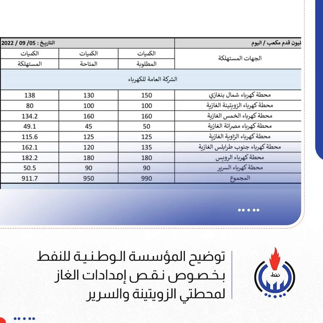 أكدت المؤسسة الوطنية للنفط، اليوم الثلاثاء، حرصها على تزويد محطات الكهرباء بالغاز وخاصة محطتي الزويتينة والسرير الغربي.
