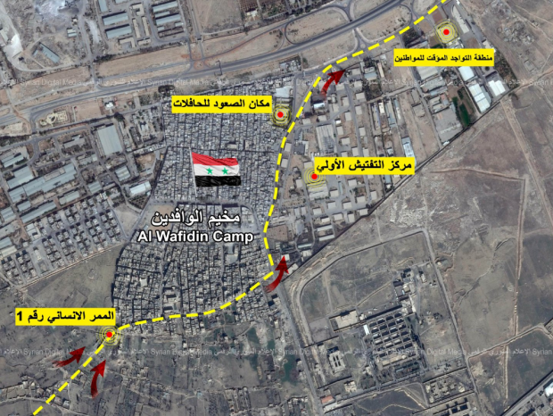 حددت يوم 27 فبراير الحكومة السورية بدعم روسيا، نظام وقف إطلاق النار في الغوطة الشرقية. وقد تم إقامة نقاط التفتيش في مخيم الوافدين. وهناك الأطباء مستعدون لتقديم الرعاية الطبية اللازمة للمرضى والجرحى. وبالإضافة إلى ذلك قد وصل عدة الحافلات بهدف نقل السكان إلى المناطق الآمنة في سورية.