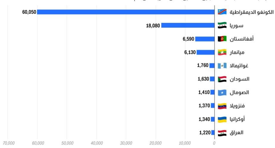 وعرضت القناة، “قائمة بالدول التي سجلت العدد الأعلى للأفراد الذين تم قبولهم كلاجئين حسب بلد المنشأ في أمريكا لعام 2023: