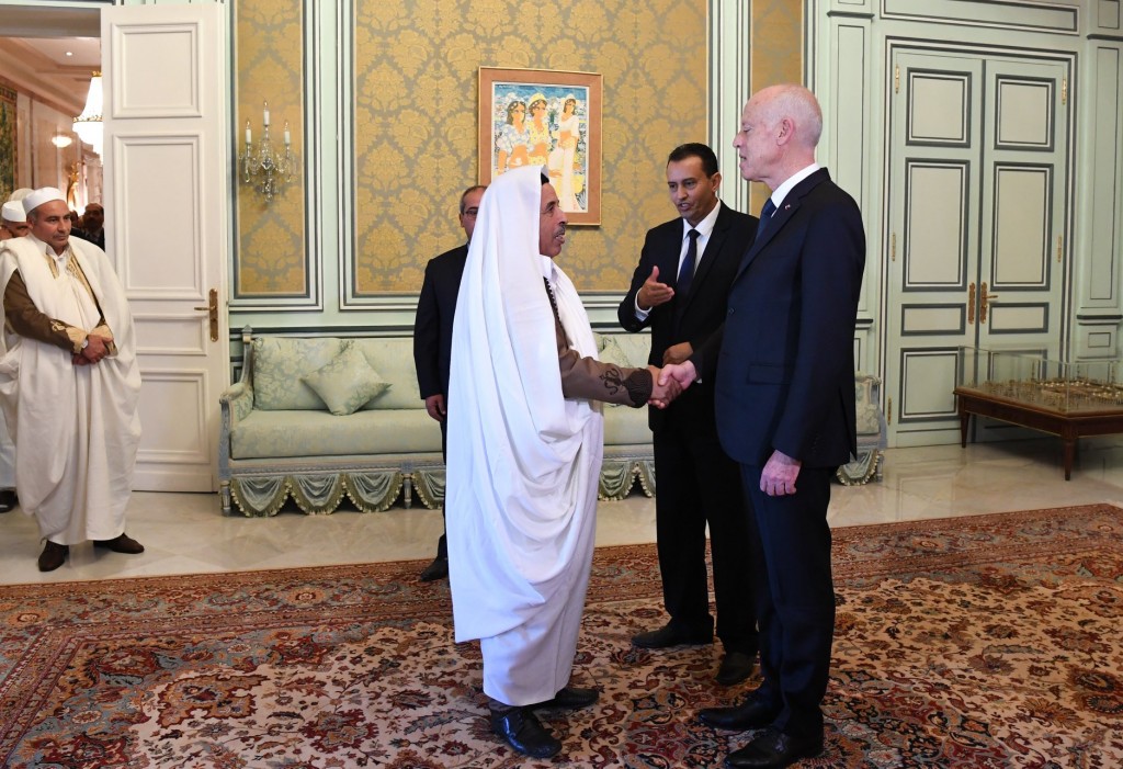 عقد رئيس الجمهورية التونسية قيس سعيّد، اجتماعًا الاثنين، بقصر قرطاج، مع ممثلي المجلس الأعلى للقبائل والمدن الليبية.