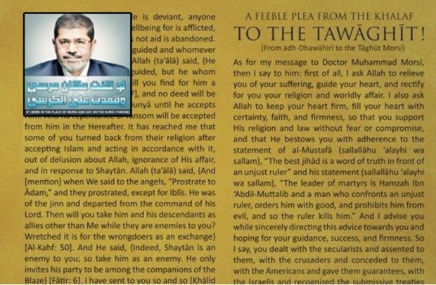 وعنونت المجلة نص الرسالة على صفحاتها، بـ”نداء ضعيف من الخَلَف إلى الطواغيت، من الظواهري إلى الطاغوت مرسي”، كما أرفقت “دابق” بالرسالة التي نشرت نصها على صفحتين من صفحاتها الـ82 صورة للرئيس المصري الأسبق وعنونتها بـ”مرسي الطاغوت”.