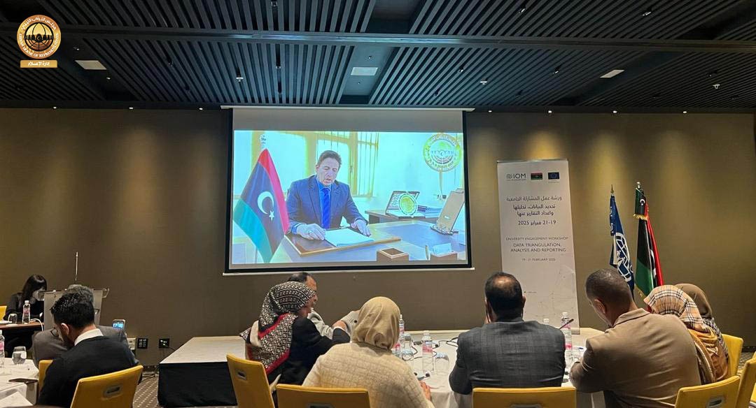 افتتح رئيس لجنة الشؤون الخارجية والتعاون الدولي بمجلس النواب يوسف العقوري، عبر الاتصال المرئي المباشر ورشة العمل التدريبية التي نظمتها منظمة الهجرة الدولية حول تحديد البيانات وتحليلها وإعداد التقرير بمشاركة عدد من الجامعات الليبية.