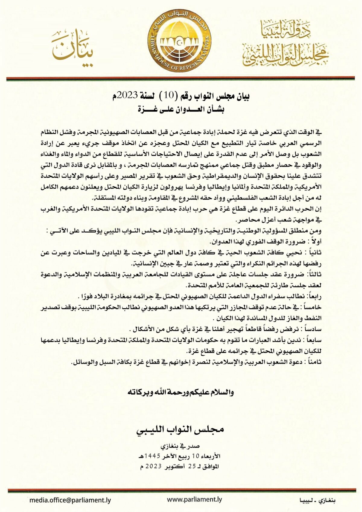 ونوه البيان إلى أنه في حالة عدم توقف المجازر التي يرتكبها الاحتلال الإسرائيلي، فإن المجلس سيطالب الحكومة الليبية المكلفة بوقف تصدير النفط والغاز للدول المساندة لإسرائيل.