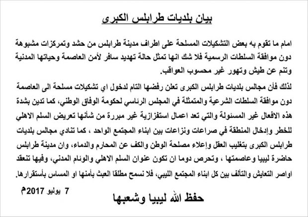 أعلن مجلس بلديات طرابلس الكبرى، في بيان نشر عشية أمس الجمعة، على الصفحة الرسمية للبلدية على الفيسبوك، رفضه دخول أي تشكيلات مسلحة إلى العاصمة، دون موافقة المجلس الرئاسي لحكومة الوفاق الوطني.
