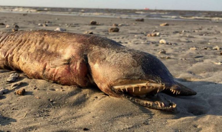 تم اكتشاف مخلوق غريب بأسنان كبيرة، بدون عيون وشكل جسم غريب من قبل أحد السكان المحليين أثناء المشي على الشاطئ في متنزه ميلتون بيتر ديميتر، بالقرب من مدينة تشارلستون الأمريكية بولاية ساوث كارولينا.