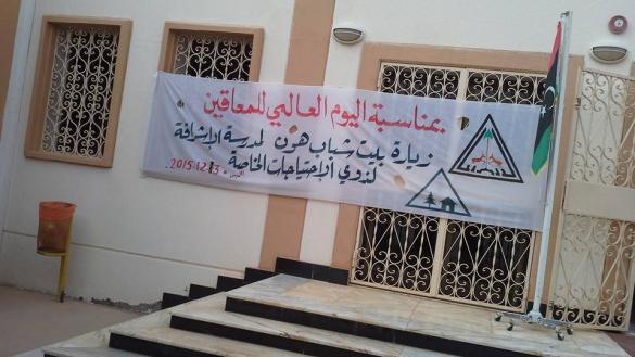 احتفل بالأمس تلاميذ وطلبة مدرسة الاشراقة لذوي الاحتياجات الخاصة بمدينة هون باليوم العالمي للمعاقين بمشاركة جمعية بيوت شباب هون وفوج الكشاف بالمدينة وحضور طيب من اولياء امور التلامذة وبعض الداعمين من اهل الخير لهذه المؤسسة التعليمية، واشتمل الحفل على العاب ترفيهية وتوزيع الهدايا والقاء الكلمات.