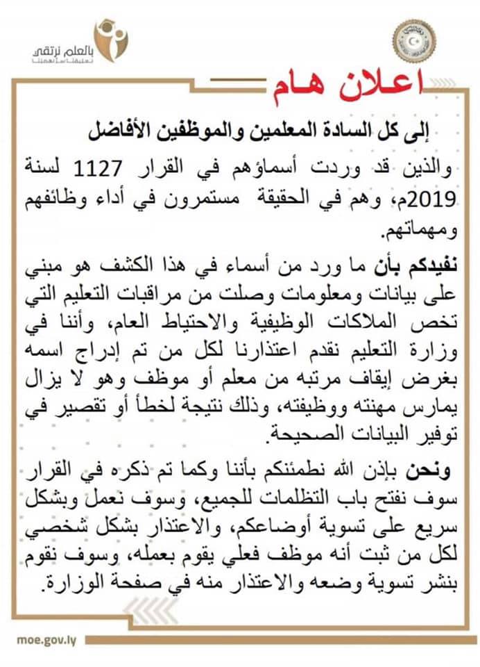 طالب مراقب تعليم بلدية مصراتة أ. إسماعيل الهادي اعبيد، بشطب عدد 9842 من المذكورين في قائمة الموقوفين بموجب قرار وزير التعليم بحكومة الوفاق رقم (1127) لسنة 2019 بشأن إيقاف مرتبات عاملين تجاوز عددهم 152 ألف وتسعمائة موظف يتقاضون معاشاتهم من الوزارة.