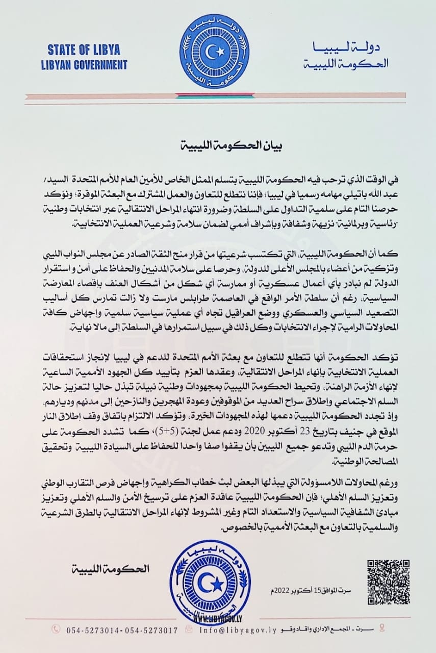 وأكّدت الحكومة الليبية المكلفة في بيان لها، حرصها على سلمية التداول السلمي على السلطة، وضرورة إنهاء المراحل الانتقالية في البلاد، وذلك عبر انتخابات وطنية رئاسية وبرلمانية.