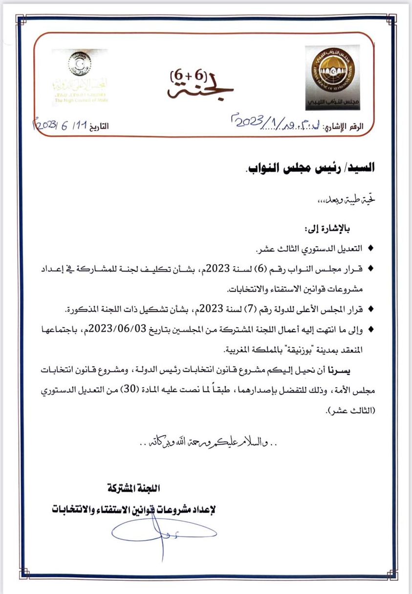 وفي وقت لاحق، أفاد المكتب الإعلامي للمجلس ، بأن رئيس لجنة 6+6 عن المجلس الأعلى للدولة عمر أبوليفة، قد أحال إلى رئيس مجلس النواب مشروع قانون انتخاب رئيس الدولة، ومشروع قانون انتخاب مجلس الأمة؛ وذلك لإصدار القانونين طبقا لما نصّت عليه المادة (30) من التعديل الدستوري الثالث عشر.