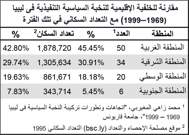 هذا التطابق المثير للإهتمام بين تعداد المناطق وحصتها من النخبة السياسية التنفيذية وغياب التنمية الذي ربما أستثنى نسبيا البيضاء، وسرت، وبنغازي، وطرابلس، ومصراتة بينما طال بصورة أكبر (نسبيا) الجنوب، ومناطق الهلال النفطي، والجنوب الشرقي، وجبل نفوسة، يقودنا إلى البحث عن أسباب أخرى للتخلف وإنخفاض مستويات التنمية الذي نعانيه جميعا، كالفساد الذي لا يمكن إستثناء النخب التنفيذية البرقاوية سنه، والإبتعاد عن تبسيط الأمور وإختزالها في الشعار التحريضي “لا لتهميش برقة”.