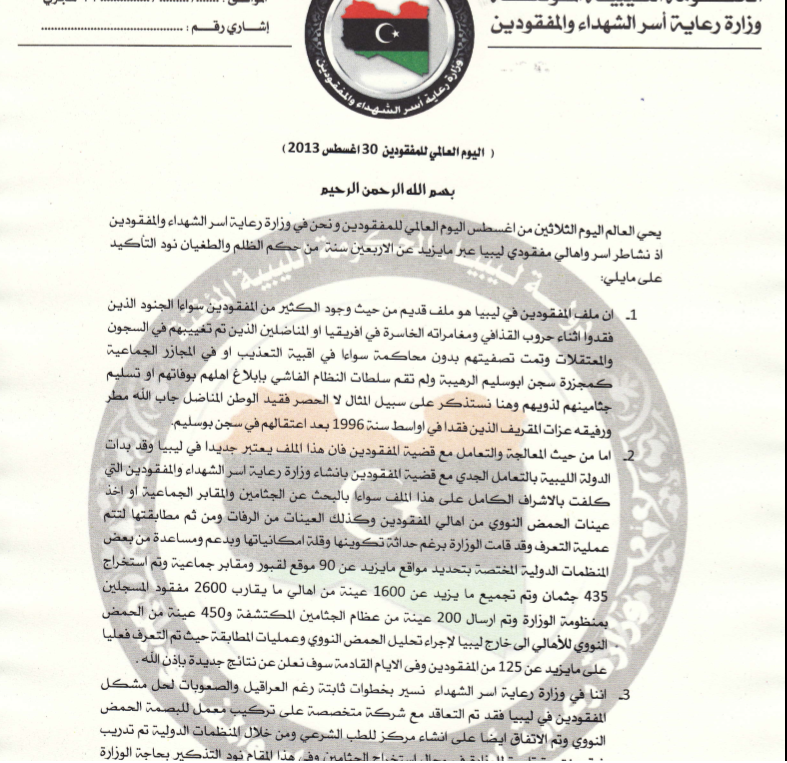 قال وكيل وزارة رعاية أسر الشهداء والمفقودين محمد الرجيلي إن الوزارة تقوم بإعداد مسودة لقانون المفقودين ينظم التعامل مع المفقودين في ليبيا وسيتم عرضه في الفترة القادمة على المؤتمرالوطني العام لإقراره.