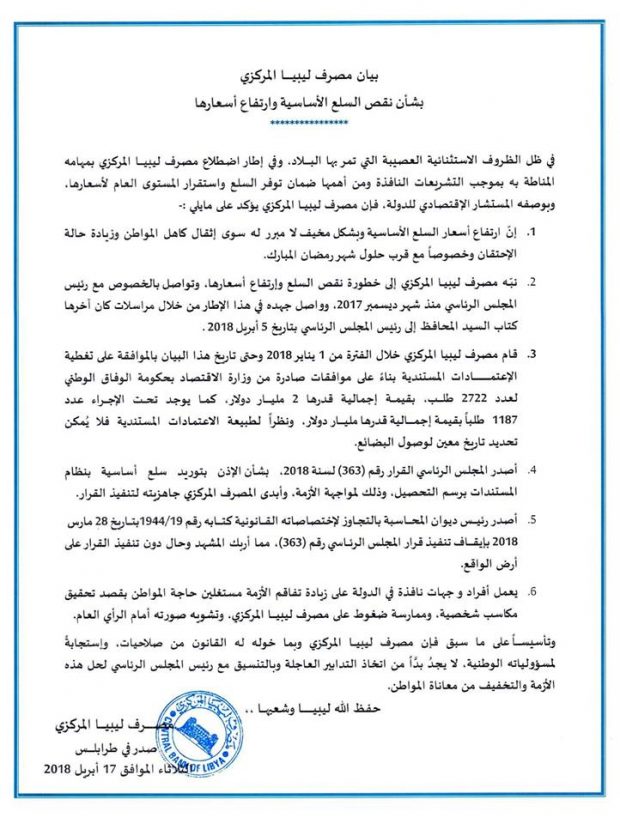 حيث أعلن المصرف في بيانه عن التواصل بخصوص نقص السلع وارتفاع أسعارها مع رئيس المجلس الرئاسي منذ شهر ديسمبر 2017، ومواصلة الجهد في هذا الإطار من خلال مراسلات كان آخرها كتاب السيد المحافظ إلى رئيس المجلس الرئاسي بتاريخ 5 أبريل 2018، كما قام خلال الفترة من 1 يناير 2018، وحتى تاريخ هذا البيان بالموافقة على تغطية الاعتمادات المستندية بناء على موافقات صادرة من وزارة الاقتصاد بحكومة الوفاق لعدد 2722 طلب، بقيمة إجمالية قدرها 2 مليار دولار.