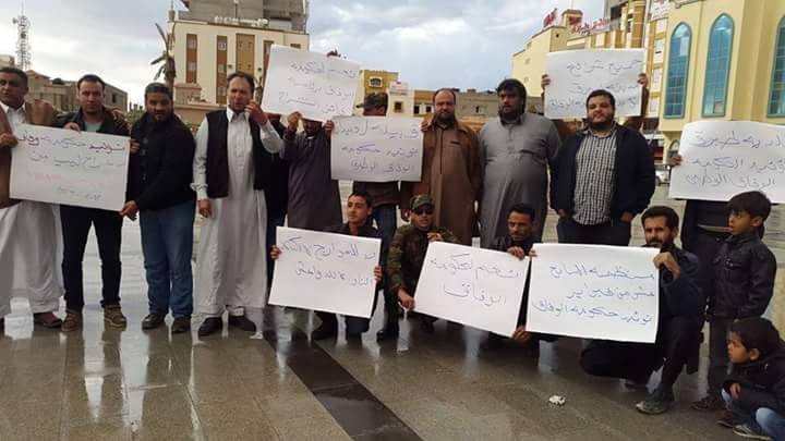 وقال أحد المتظاهرين أن حكومة الوفاق هي خيارنا الأخير وهي الحل الأمثل لما نعانيه من نقص في الحاجات الضرورية وغلاء المعيشة وارتفاع سعر الدولار بالاضافة إلى انتشار السلاح والفوضى.