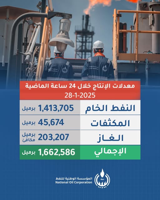 أعلنت المؤسسة الوطنية للنفط، أنه “بلغت معدلات إنتاج ليبيا من النفط الخام اليوم 1،413،705 برميل يومياً، ومن المكثفات 45،674 برميل”.