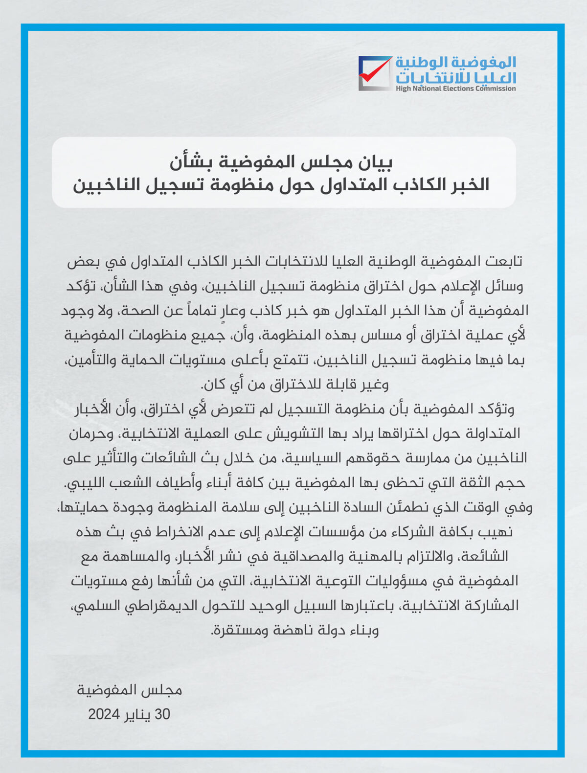 وأكدت مفوضية الانتخابات بأن منظومة التسجيل لم تتعرض لأي اختراق، وأن الأخبار المتداولة حول اختراقها يراد بها التشويش على العملية الانتخابية، وحرمان الناخبين من ممارسة حقوقهم السياسية، من خلال بث الشائعات والتأثير على حجم الثقة التي تحظى بها المفوضية بين كافة أبناء وأطياف الشعب الليبي.