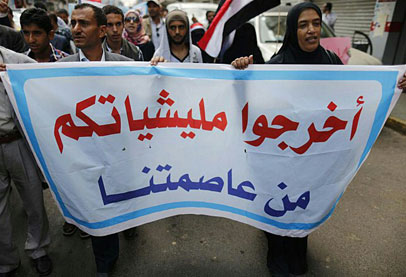 وطالب المتظاهرون الرئيس المستقيل بـ”فرض سلطة الدولة” امام الطوق الذي يفرضه الحوثيون على العاصمة.