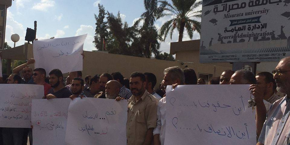 أعلن موظفو إدارة جامعة مصراتة، اليوم الأحد، دخولهم في اعتصام مفتوح لتسوية لأوضاعهم والنظر في مطالبهم.