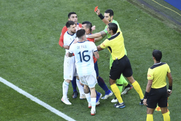 وتلقى ليونيل ميسي البطاقة الحمراء في المباراة، في الدقيقة 37، بعدما دخل في اشتباك عنيف مع غاري ميدال كابتن منتخب تشيلي، ليقوم حكم اللقاء بطردهما معا، وليكمل الفريقين المواجهة بعشرة لاعبين.